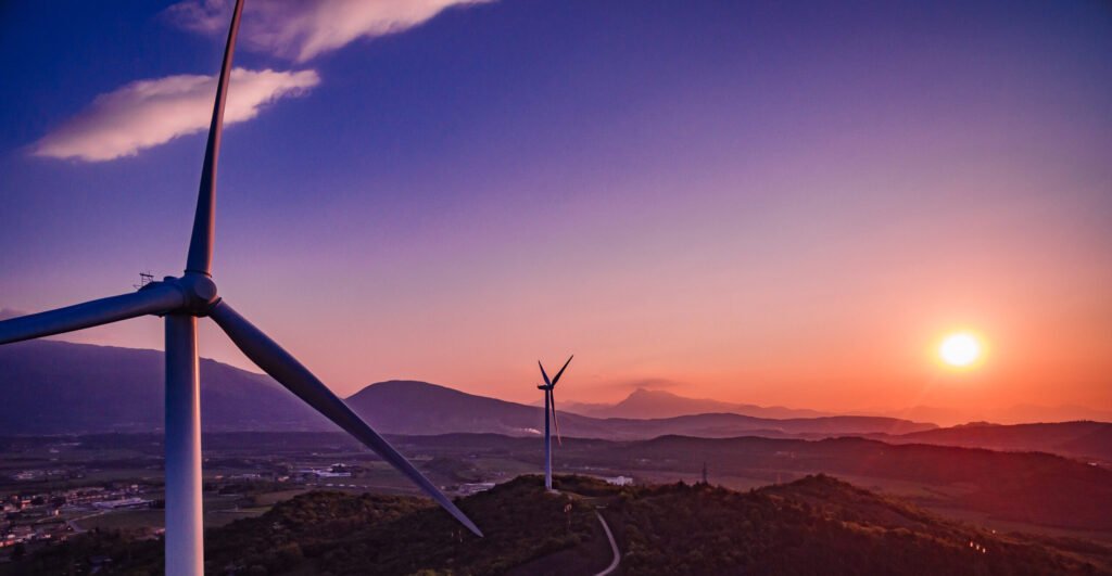 Wind Turbines Windmill Energy Farm at sunset, aerial view